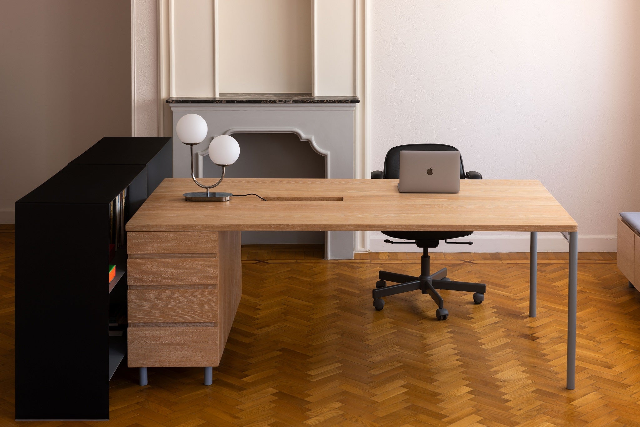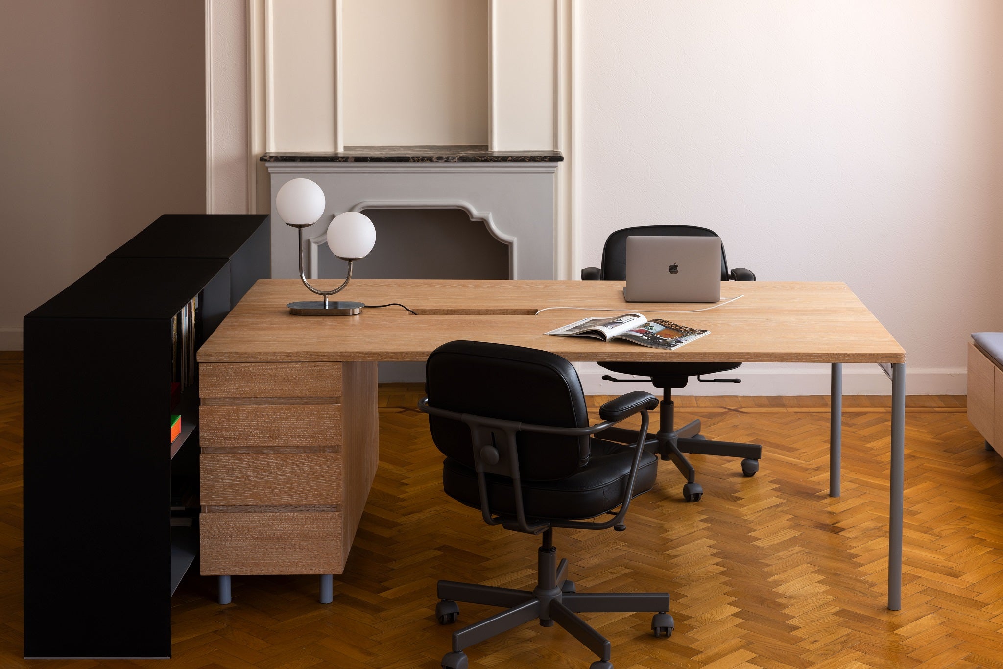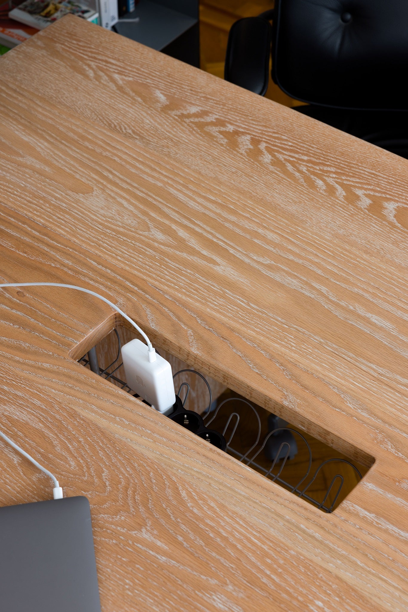 A double sided sturdy desk, especially designed for people who enjoy an outstanding work space and have a knack for personalized pieces. It includes a dual drawer unit with a personal tray divider, and a cable management tray. The combination of a solid oak wood top and an engineered metal system give this piece a light floating effect. Â
