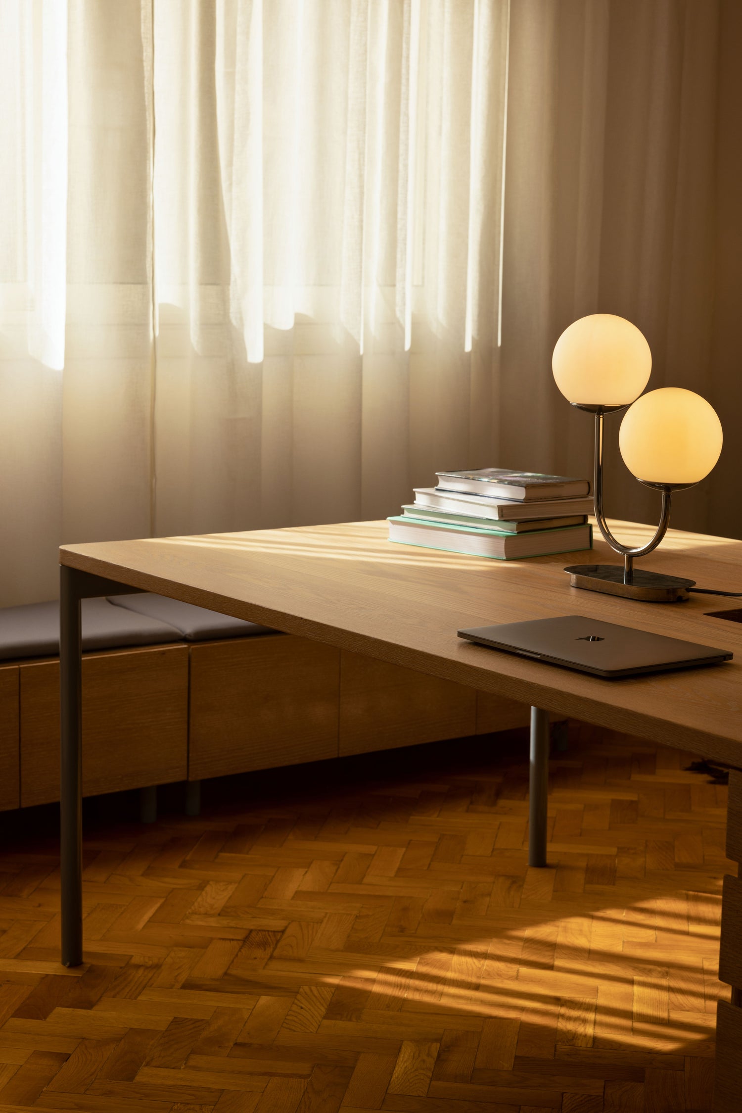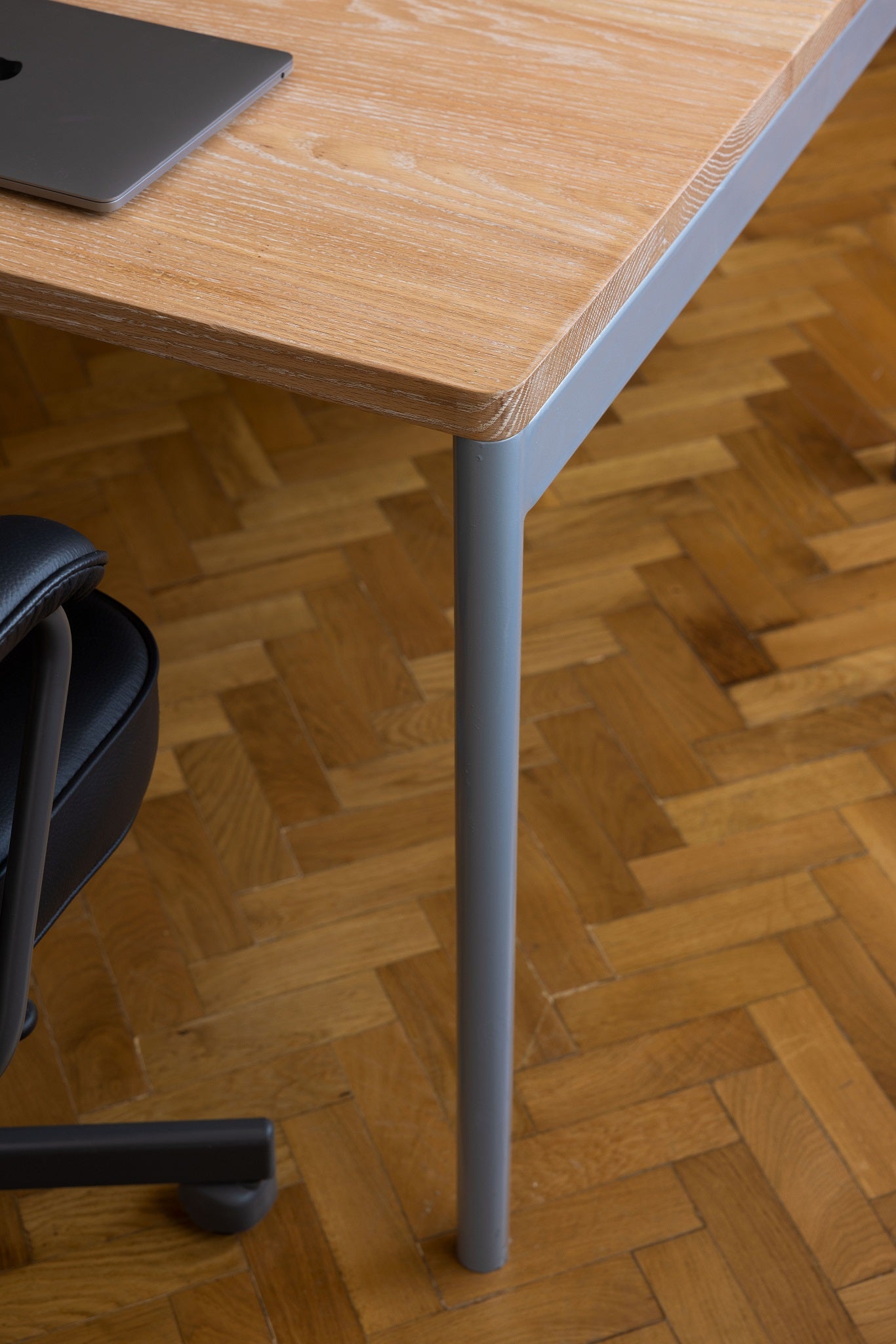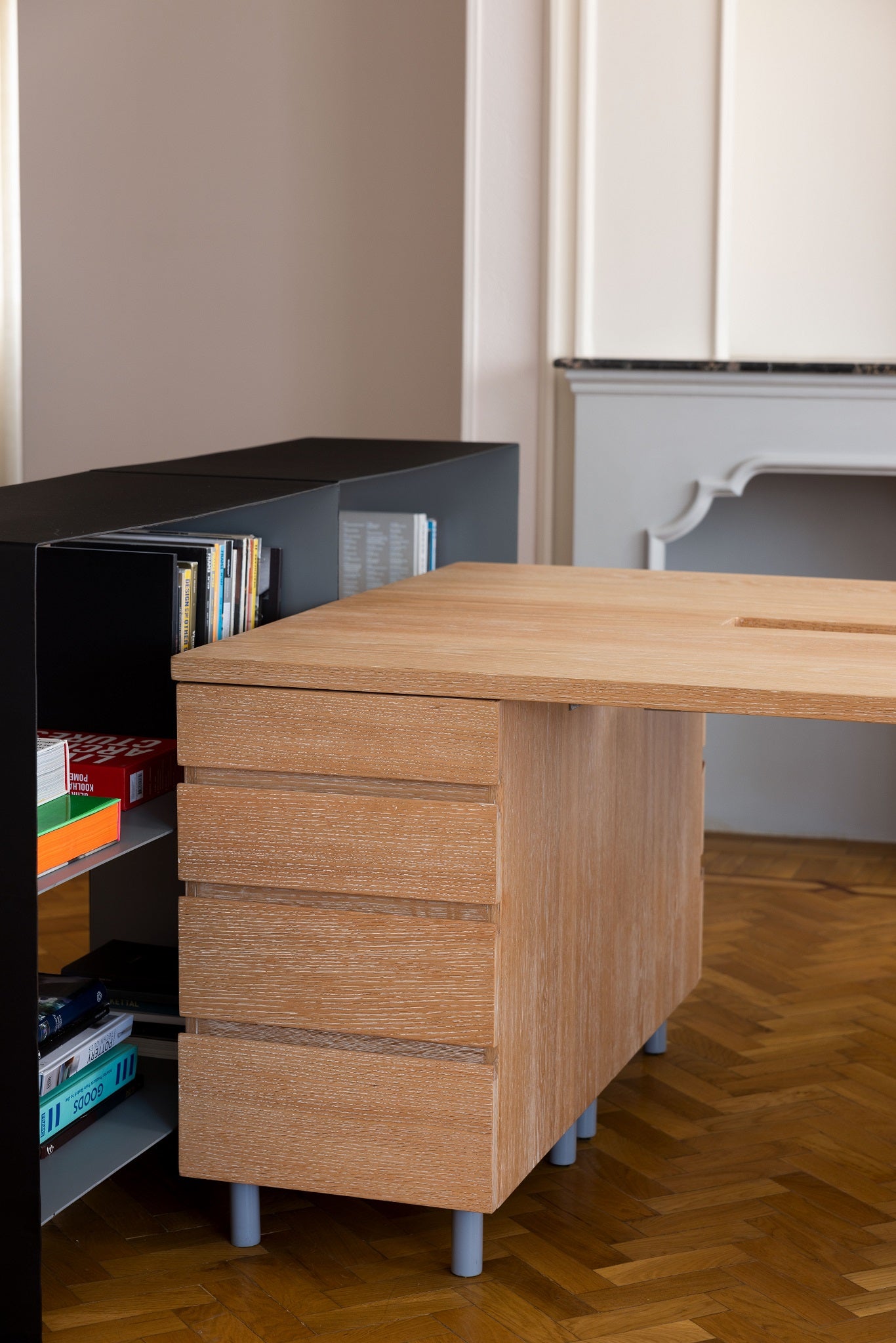 A double sided sturdy desk, especially designed for people who enjoy an outstanding work space and have a knack for personalized pieces. It includes a dual drawer unit with a personal tray divider, and a cable management tray. The combination of a solid oak wood top and an engineered metal system give this piece a light floating effect. Â