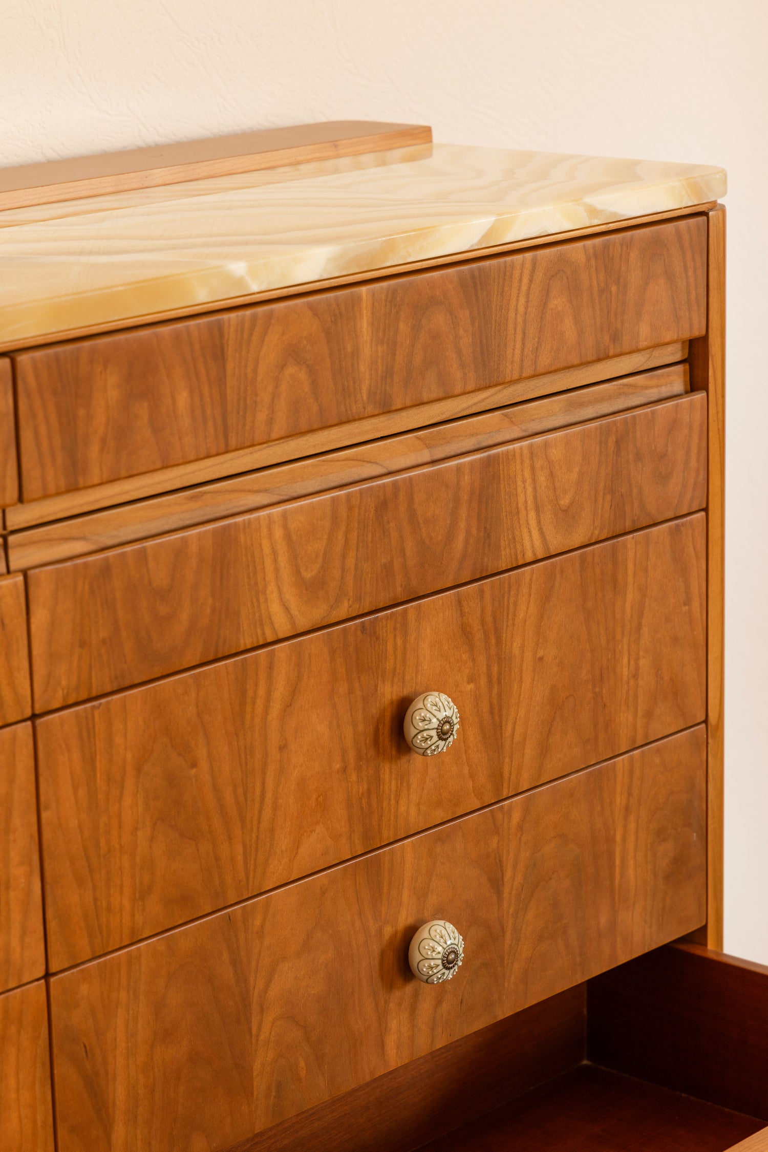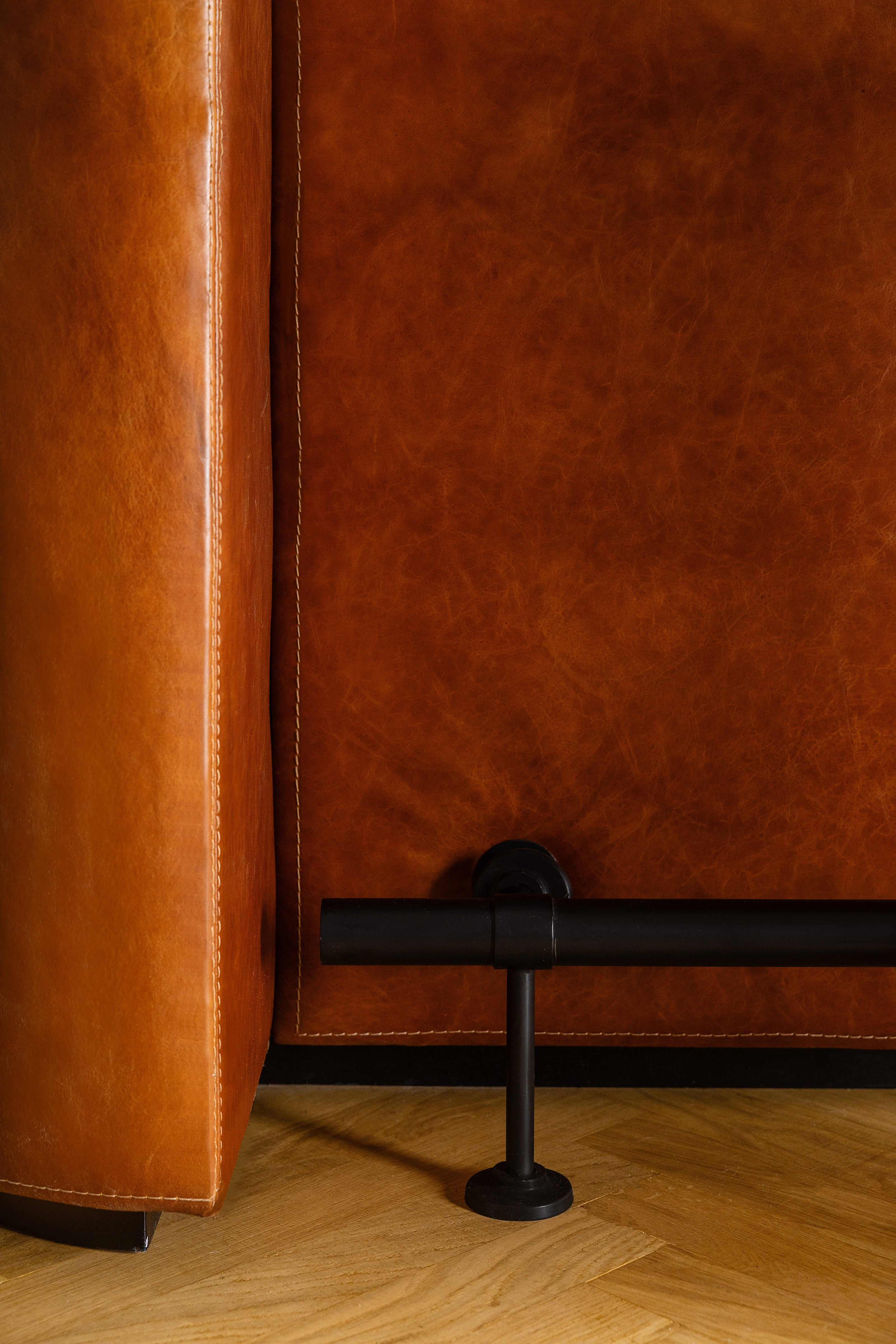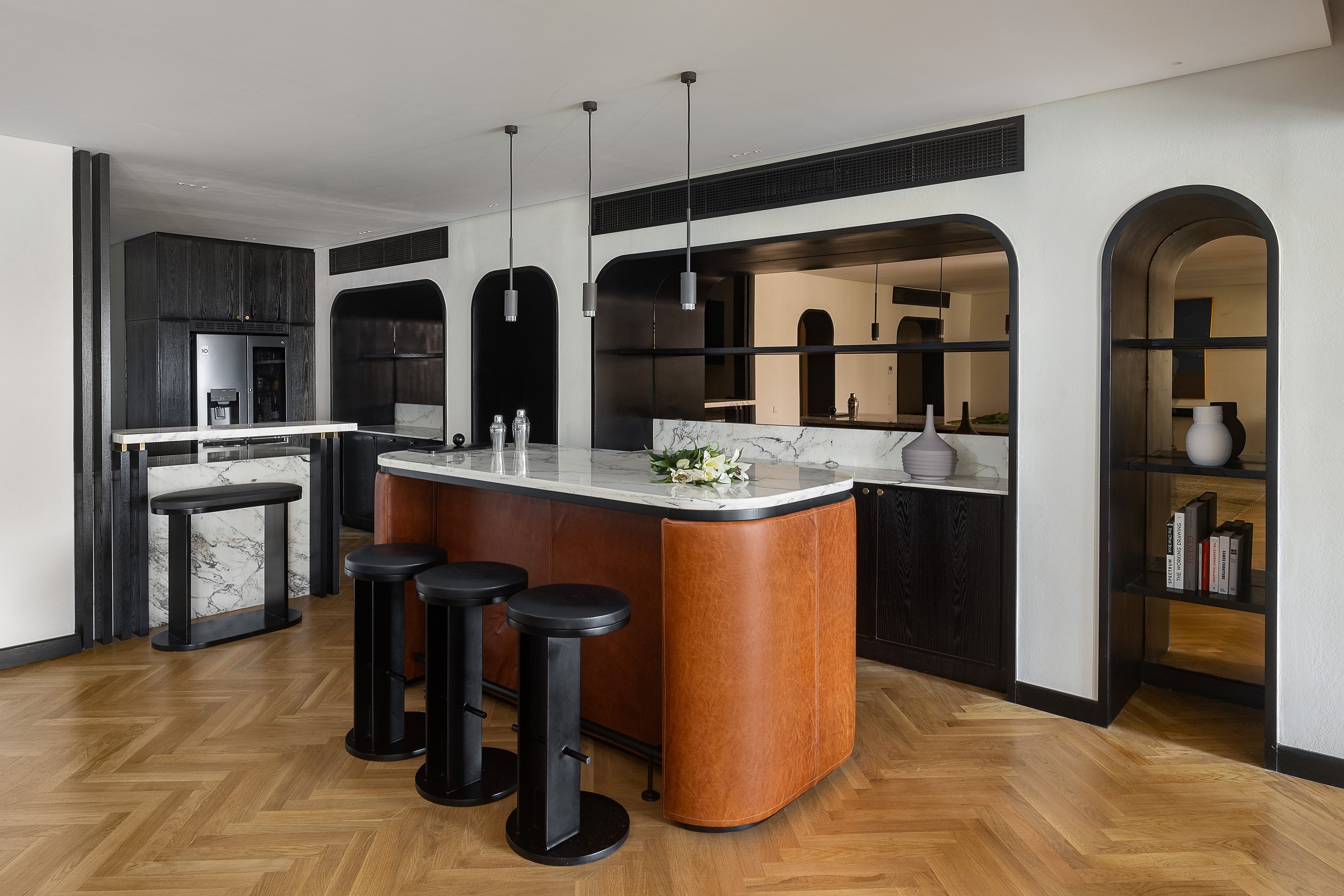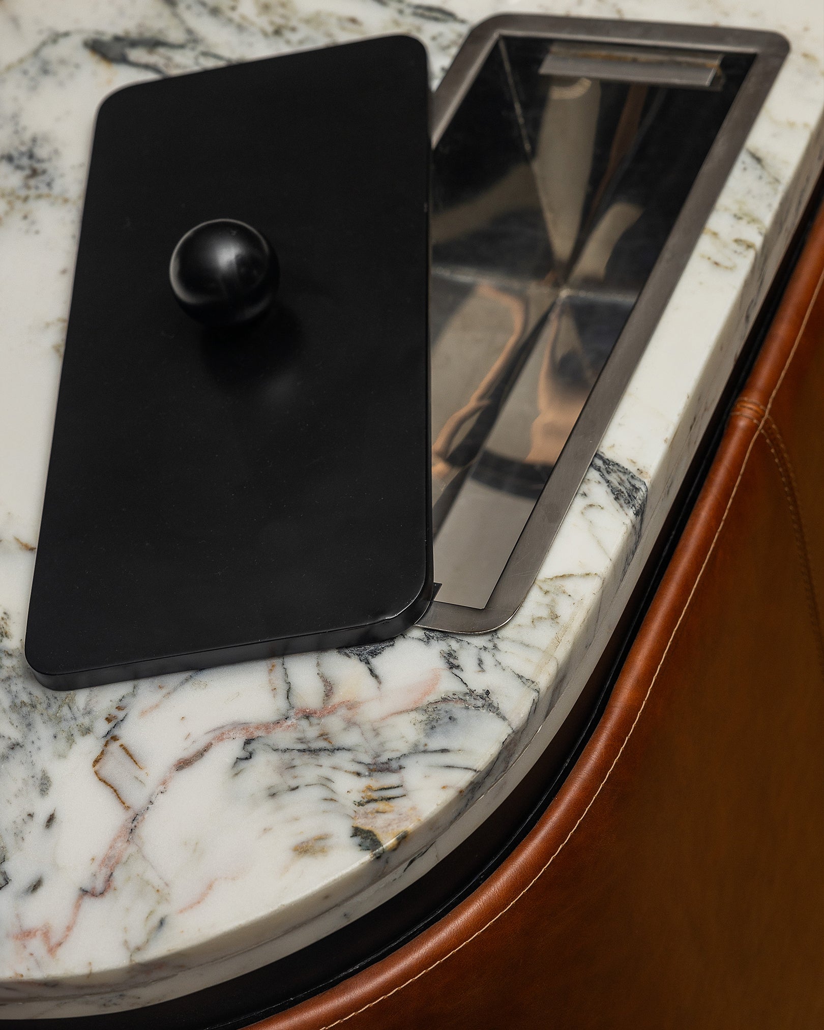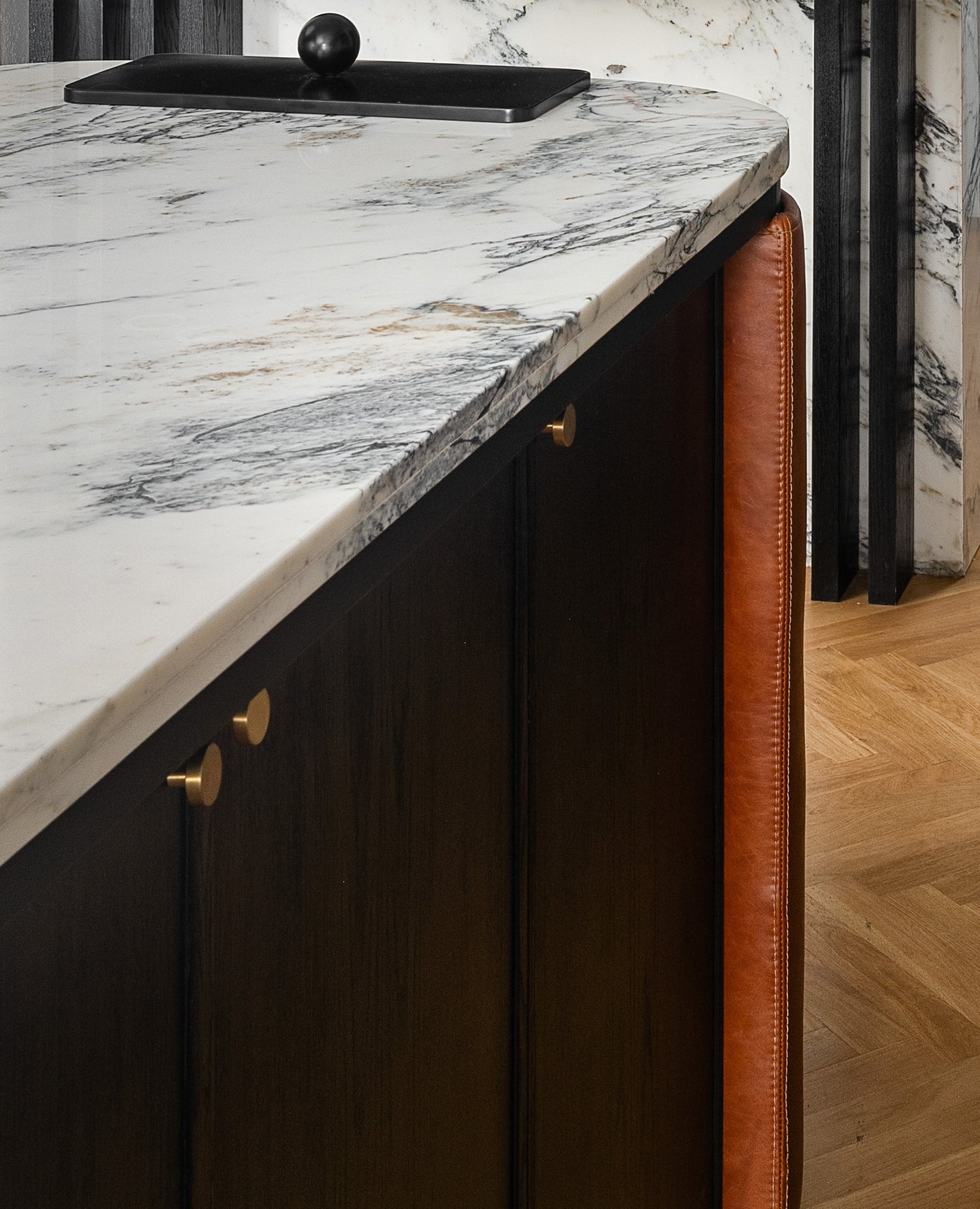 A bespoke leather clad unit that is reminiscent of vintage bar counters. Natural materials were instrumental in this project, the ebb and flow between black stained wood and the gorgeously veined white marble. Cabinetry is then adorned by using brass accents, ice-bucket with a removable lid; and black stainless steel footrails.