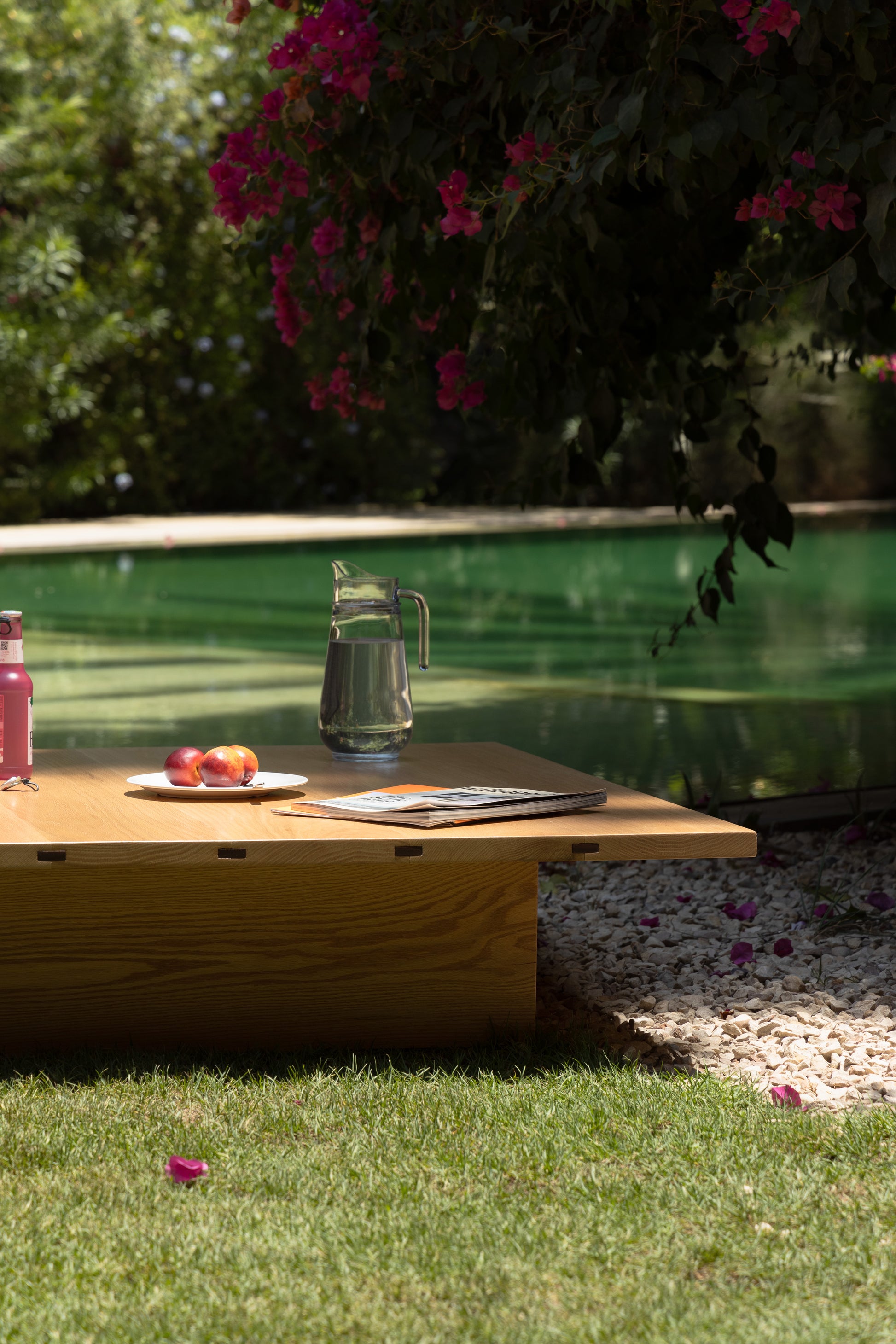 A floating table with a captivating planar surface that exhibits the beauty of natural wood. This coffee table is completely made of solid oak wood, and is adorned with contrasting inlays in a flirtatious manner.